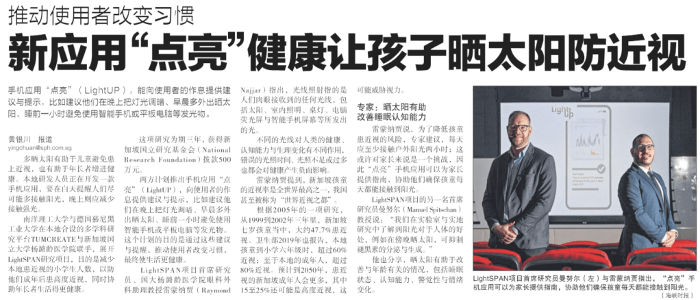 “本地研发新应用“点亮” 促家长让孩子多晒太阳防近视 – Singapore develops new app ‘LightUP’ to encourage parents to expose their children to more sunlight to prevent myopia”