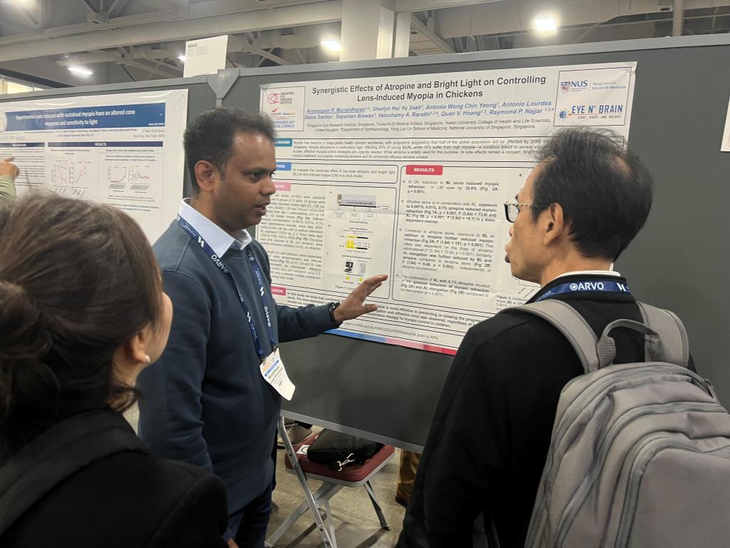 Our team was also proud to showcase two impactful poster presentations. Dr. Murali presented his work on the synergistic effects of atropine and bright light in controlling lens-induced myopia in chickens, offering new insights into potential interventions for childhood myopia.
