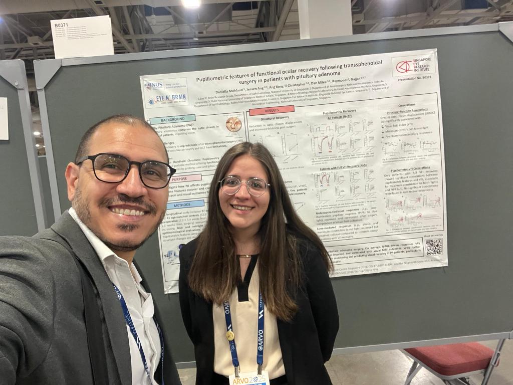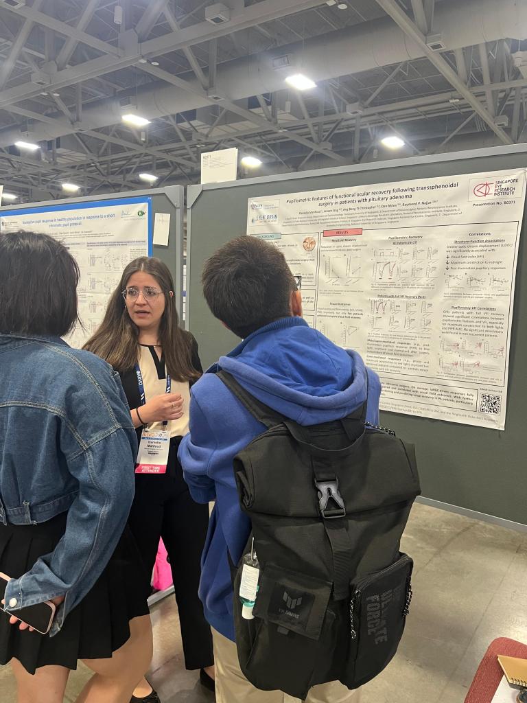 Our team was also proud to showcase two impactful poster presentations. Dr. Murali presented his work on the synergistic effects of atropine and bright light in controlling lens-induced myopia in chickens, offering new insights into potential interventions for childhood myopia. PhD student Daniella Mahfoud presented her research on pupillometric features of ocular recovery following transsphenoidal surgery in patients with pituitary adenoma, highlighting the clinical value of pupillometry in tracking visual function and recovery.