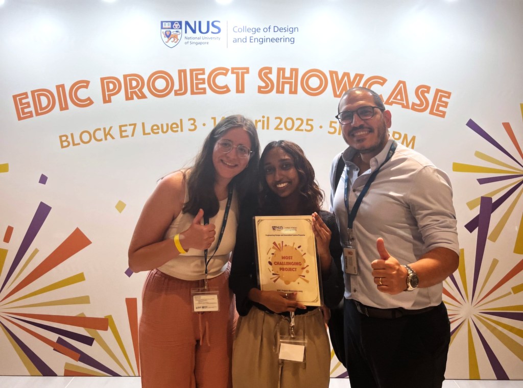 🏅 “Most Challenging Project” Award at the EDIC Project Showcase 2025 (College of Design and Engineering) – recognising her persistence and success in delivering one of the most complex and demanding projects of her academic journey