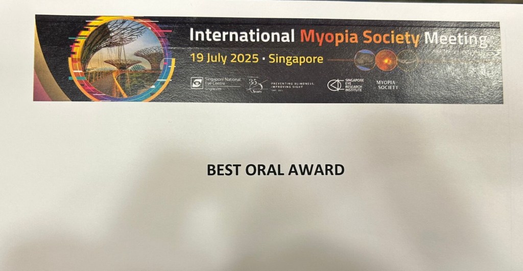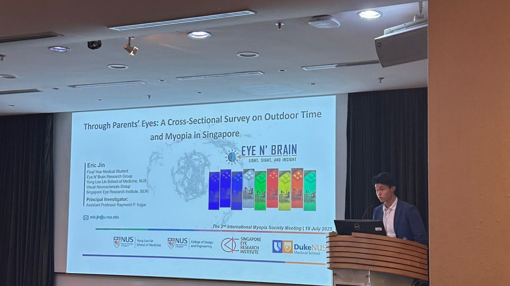 We’re delighted to celebrate Eric Jin for winning the Best Oral Communication Award at the International Myopia Society Meeting, held on 19 July 2025 at the Singapore National Eye Centre (SNEC). Presenting his study titled “Through Parents’ Eyes: A Cross-Sectional Survey on Outdoor Time and Myopia in Singapore,” Eric explored how parents’ perceptions of their children’s outdoor activities relate to myopia trends. His thoughtful approach brought new perspective to tackling a growing public health concern in Singapore and across Asia. This recognition is especially meaningful as Eric is just at the start of his medical journey — a first-year student working under the mentorship of Dr Raymond P Najjar with the Eye N’ Brain Research Group, and supported by collaborators from SERI, NUS, and Duke-NUS Medical School. 🏆 The award is a strong testament to Eric’s communication skills, curiosity, and commitment to impactful research. Congratulations, Eric — we’re excited to see what comes next!